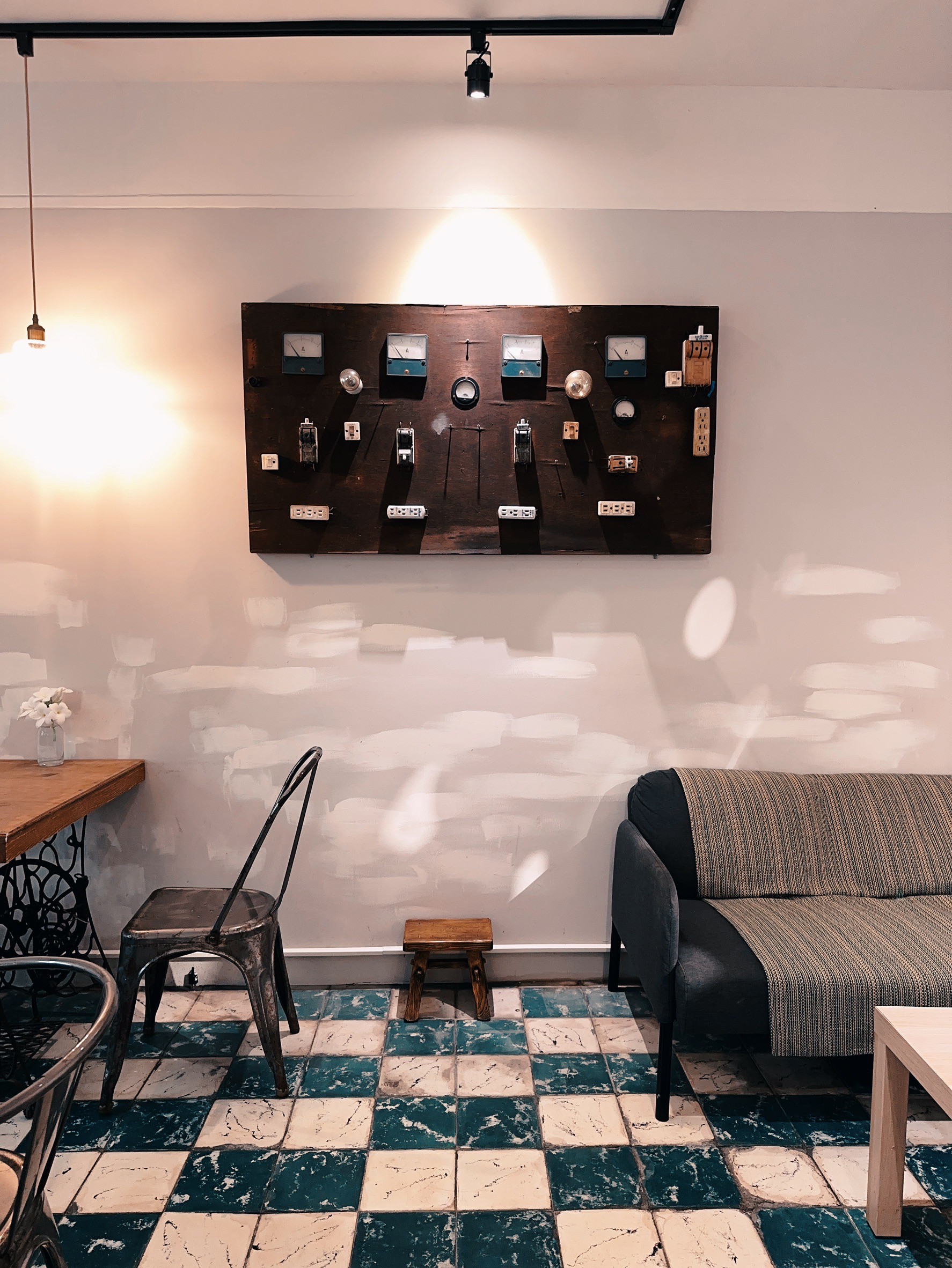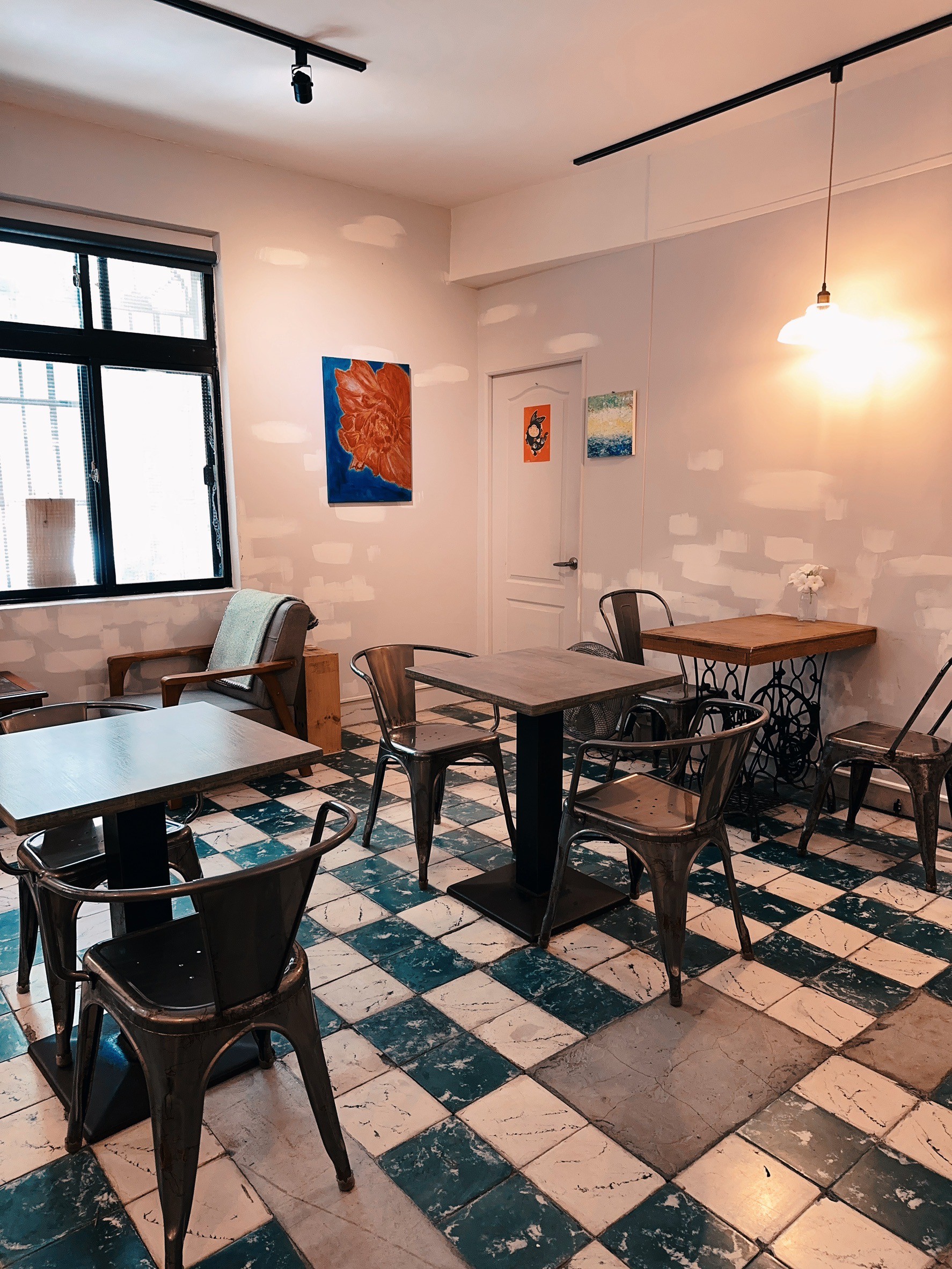 黑金魚咖啡館位在唭哩岸捷運站附近,外觀保留了老屋的韻味,內部則結合簡約工業風和懷舊元素。座位比前兩間店都大得多,巧妙地規劃了:騎樓戶外席、窗邊小角落、長椅木桌及沙發區,無論是一人獨坐放空、閱讀,或朋友聚會,都能找到理想的位置。