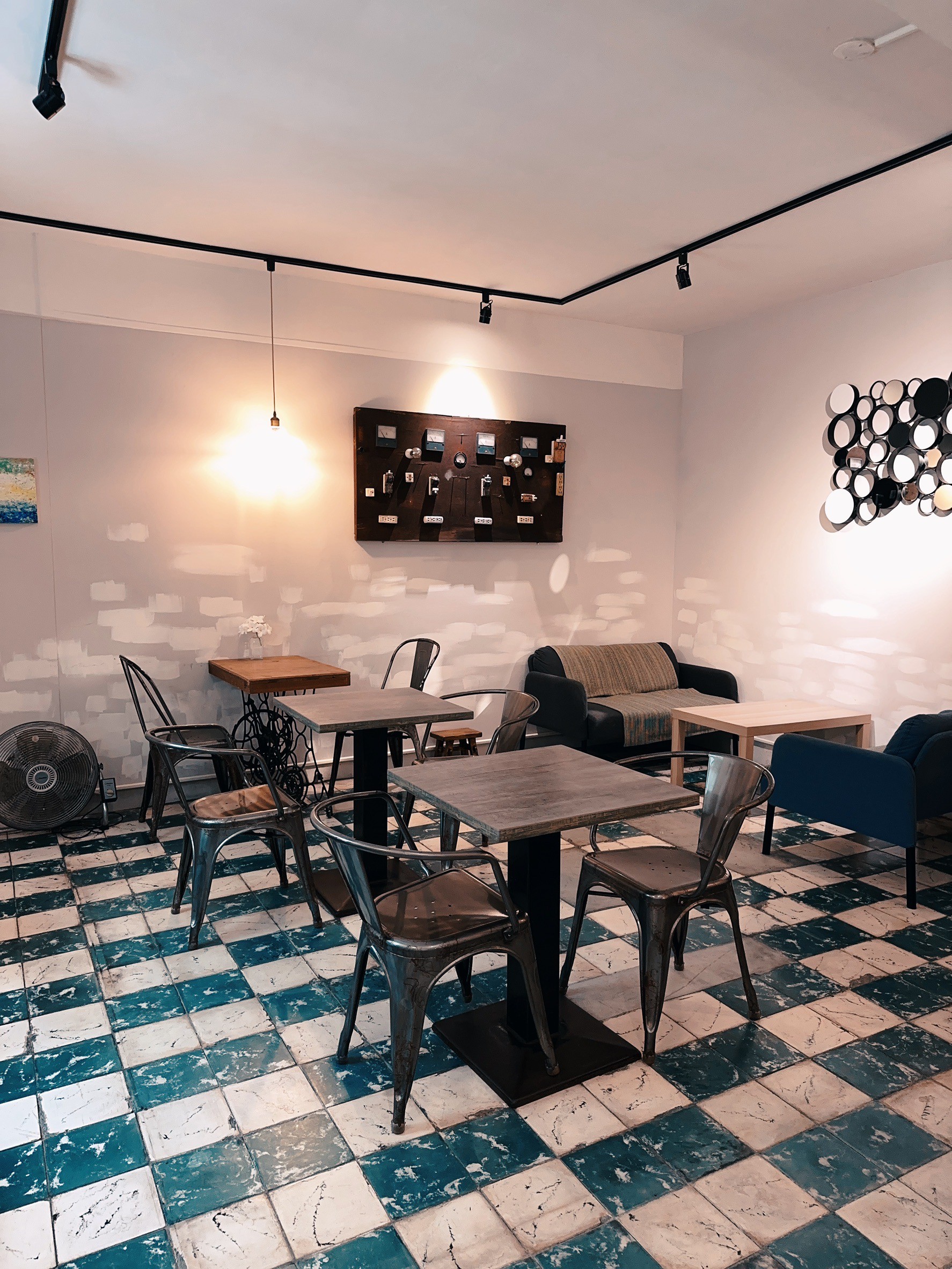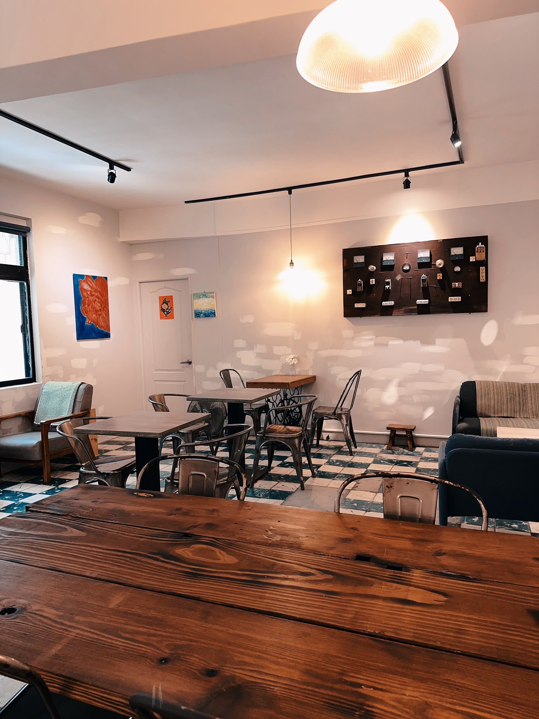 黑金魚咖啡館位在唭哩岸捷運站附近,外觀保留了老屋的韻味,內部則結合簡約工業風和懷舊元素。座位比前兩間店都大得多,巧妙地規劃了:騎樓戶外席、窗邊小角落、長椅木桌及沙發區,無論是一人獨坐放空、閱讀,或朋友聚會,都能找到理想的位置。