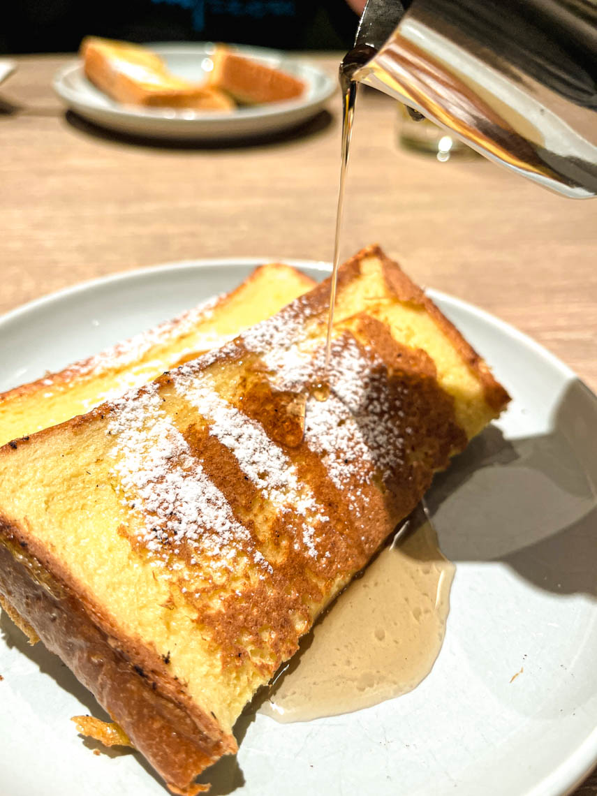 法國吐司上面會撒上一些糖粉,再淋上楓糖漿一起享用,這法國吐司一定要趁熱吃才香!楓糖漿的量就看個人喜好,建議一次不要倒太多,不夠味再加就好,不然味道都被蓋掉了。
