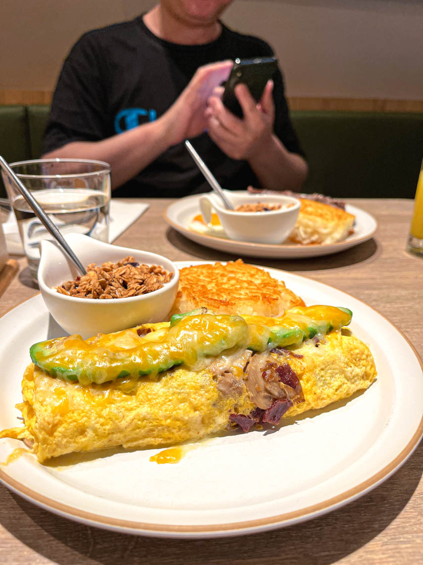 裡面有洋蔥、洋菇、蘆筍、甜椒、番茄、酪梨、火腿、培根、起司,沒想到蛋捲竟然用的非常的水潤,雖然豬油對酪梨沒特別喜愛,但搭起來完全無違和感,一口咬下去滿滿的餡料,蛋香味十足。