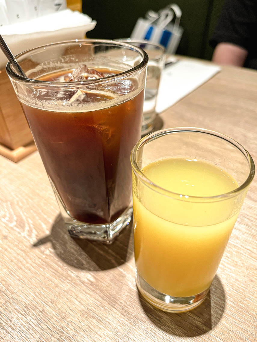 套餐附含飲料 一杯新鮮果汁 (當天是柳橙汁) 以及 咖啡 或 紅茶,冰的熱的都可以,而且都是可續杯。